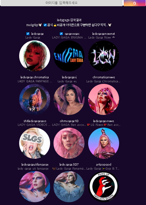 돋보기 모양의 검색을 클릭하면 찾으려고 하는 계정과 비슷한 아이디까지 모두 검색하여 결과를 보여 줍니다. 그중에 자신이 찾고 있는 사용자의 프로필 사용자의 사진 위에 있는 인스타그램 사용자 명을 클릭하면 인스타 스토리의 사진과 동영상을 볼 수 있습니다. 아래 사진과 같이 ladygaga를 검색하면 공식 계정과 함께 유사 계정, 팬 계정까지 모두 검색하여 검색 결과를 보여줍니다.