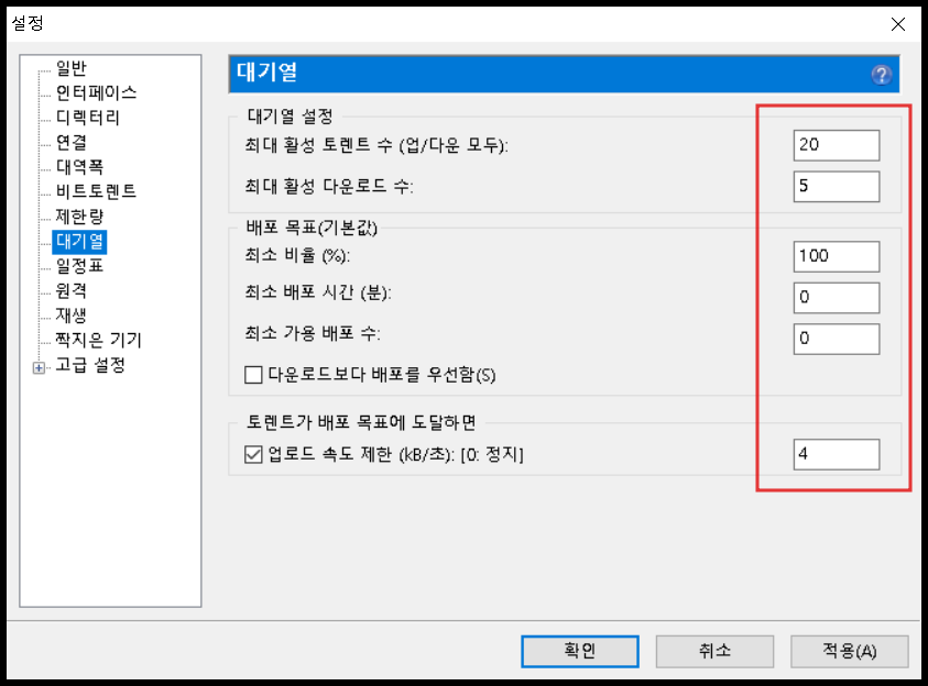 대기열 설정에서 '최대 활성 토렌트 수'와 '최대 활성 다운로드 수'는 각각 최소 50 이상 비슷한 숫자로 해주는 것이 좋습니다. 60/60이나 100/100처럼 적당히 비슷한 범위 내에서 설정해 주는 것이 좋습니다. 물론 동시에 많은 파일을 한꺼번에 받을 일이 없다면 '최대 활성 다운로드 수'를 줄일 수도 있습니다. 다만 첫 번째 옵션인 '최대 활성 토렌트 수(업/다운 모두)' 수를 줄이면 당연히 속도가 떨어집니다.