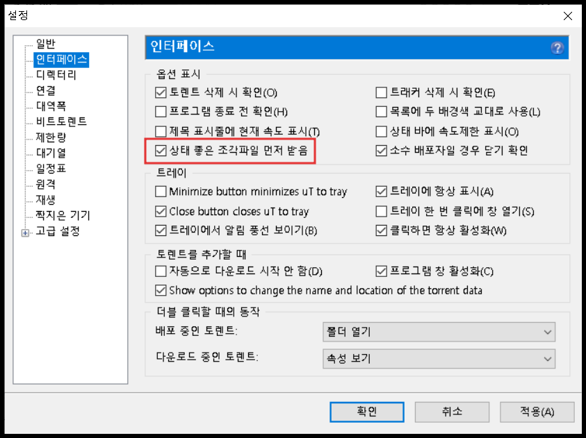 메뉴에서 일반 밑에 있는 인터페이스 창으로 이동합니다.'상태 좋은 조각파일 먼저 받음'에 체크 또는 해제 이 옵션은 컴퓨터 사양이나 네트워크에 따라 선택할 수 있는 선택 옵션입니다.