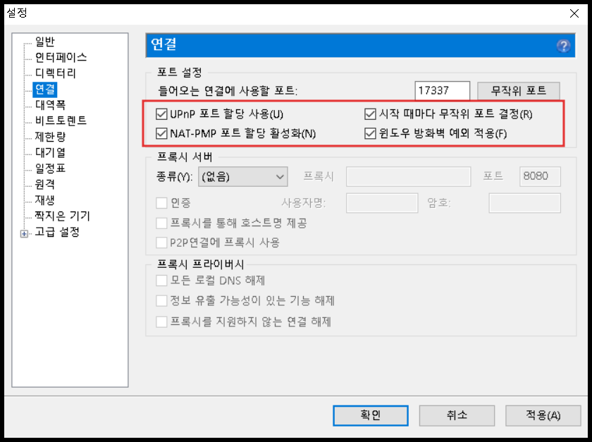 연결 메뉴의 설정은 확실하게 다운로드 속도에 영향을 줍니다. 첫 번째 설정은 '시작 때마다 무작위 포트 결정(R)'의 체크와 해제 여부입니다.