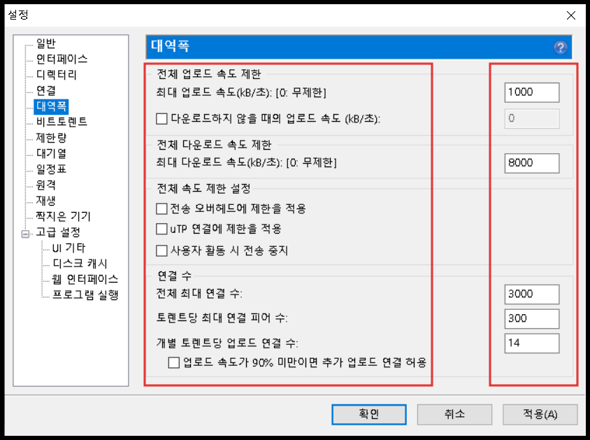 직접 실험해본 결과 어느 정도 업로드와 다운로드 설정값이 놓아야 다운로드 속도도 빨라집니다. 업로드 설정값이 작으면 파일을 주고받는 토렌트의 특성상 다운로드 속도도 떨어집니다.