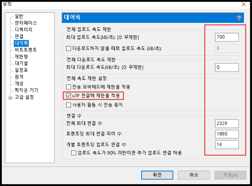 왼쪽의 설정 'uTP 연결에 제한을 적용' 체크는 기본 설정입니다. 이것 이외에는 모두 해제로 합니다. 아래 사진처럼 모든 체크를 해제하는 것이 다운로드 속도를 올릴 수 있다고 하는 사람도 있지만 속도에 영향을 주지는 않았습니다. 왼쪽의 숫자 변경은 확실히 속도에 영향을 주었으며 다운로드 속도가 빨라졌습니다. 자신의 컴퓨터 및 네트워크 환경에 따라 다룰 수 있으니 체크와 해제 둘 다 적용해보시고 선택하시면 될 것 같습니다.