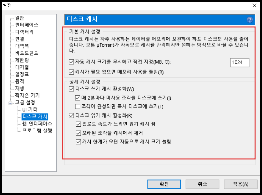토렌트 디스크 캐시에 대해서는 설명하는 사람마다 설정이 엇갈렸습니다. 어떤 사람은 설정해주는 것이 좋다고 하고 어떤 사람은 설하지 않아도 된다고 하고 설정 방법도 어떤 것은 체크하고 어떤 것은 해제하고 정말 설명하는 사람마다 제각각이었습니다.