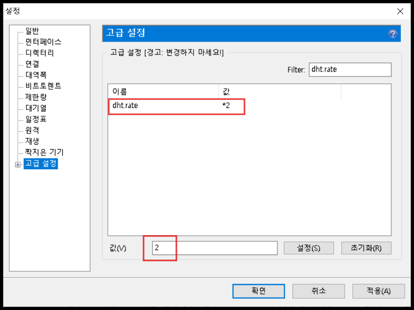 다음으로 dht.rate를 찾아 갑을 2로 설정해줍니다. Filter창에서 검색하면 쉽게 찾을 수 있습니다.