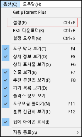 먼저 토렌트 상단 메뉴에서 옵션 텝을 눌러 설정창을 열어 줍니다. 단축키 Ctrl + P를 누르시면 바로 설정창으로 이동할 수 있습니다.