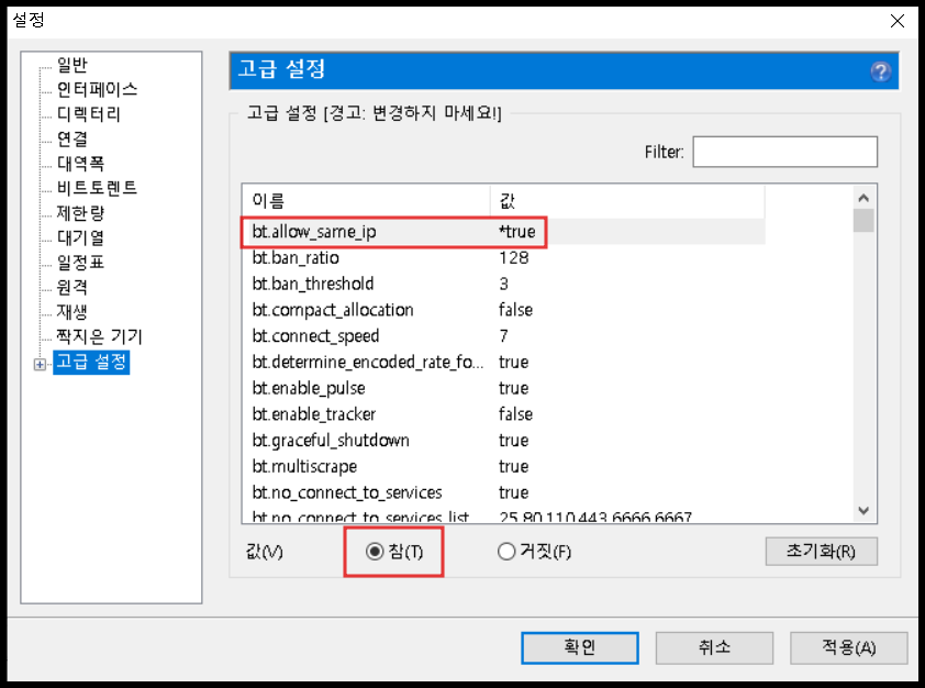 고급설정 메뉴 첫 번째 옵션에서 bt.allow_same_ip를 찾아 true(참)으로 설정해 주시면 됩니다.