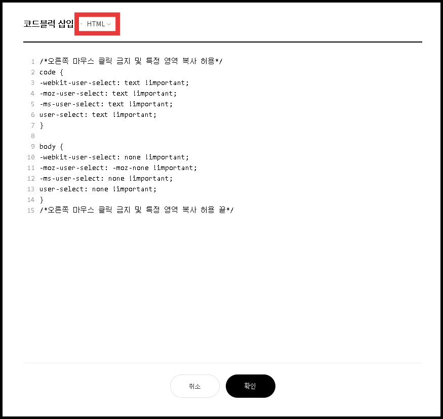 코드 블록 옆에 HTML 선택을 확인하고 본문에 복사를 허용할 글을 삽입합니다.