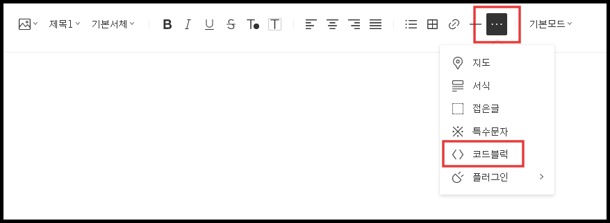 상단의 메뉴에서 구분선 옆에 있는 더보기를 클릭합니다. 더보기에서 코드 블록을 선택합니다. 그러면 다음과 같은 창이 나옵니다.