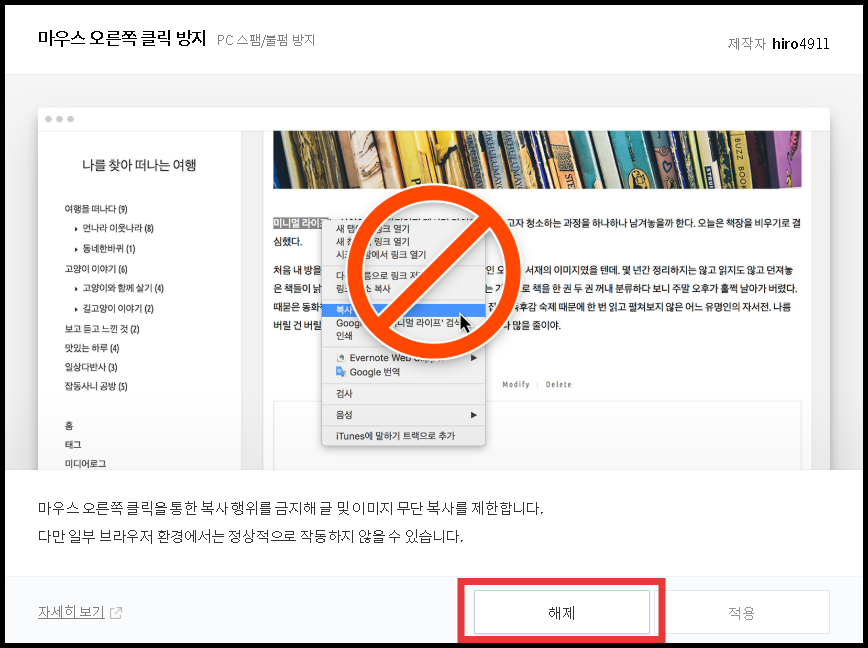 먼저 특정 영역에서만 복사를 허용하게 하기 위해서는 티스토리의 플러그인에 있는 '마우스 오른쪽 클릭 방지' 설정을 해제해야 합니다. 이 플러그인을 해제해도 소스 코드를 통해 특정 영역을 제외한 부분에는 '마우스 오른쪽 클릭 방지'가 설정되도록 할 것이기 때문에 걱정하지 않으셔도 됩니다.