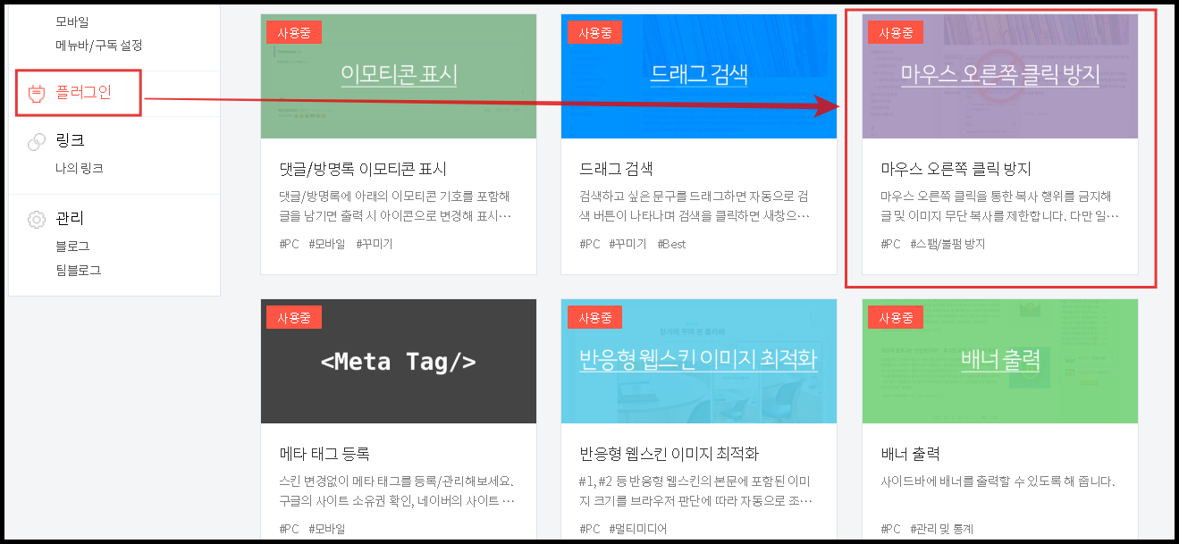 블로그 관리 탭으로 가서 플러그인을 클릭한 다음 마우스 오른쪽 클릭 방지를 클릭해서 설정을 해제합니다.