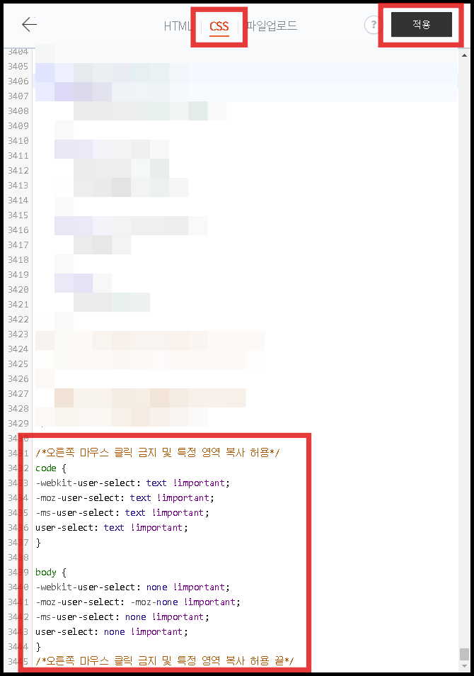 CSS 영역을 클릭하고 사진과 같이 복사한 소스코드를 CSS 영역 맨 아래 붙여 넣기를 해줍니다.