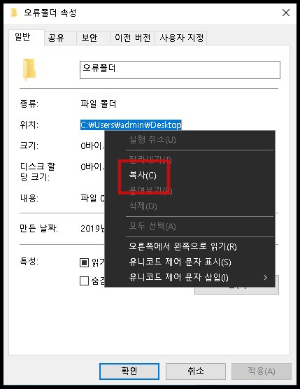 다음으로 이런 폴더나 파일의 속성으로 들어갑니다. 오른쪽 마우스를 클릭하고 R 또는 맨 아래 '속성(R)'을 클릭합니다. 그런 다음 이런 폴더나 파일의 위치를 드래그 오른쪽 마우스 클릭 복사를 해 줍니다. 삭제하려고 하는 오류난 폴더가 현재 Desktop(바탕화면)에 있습니다.