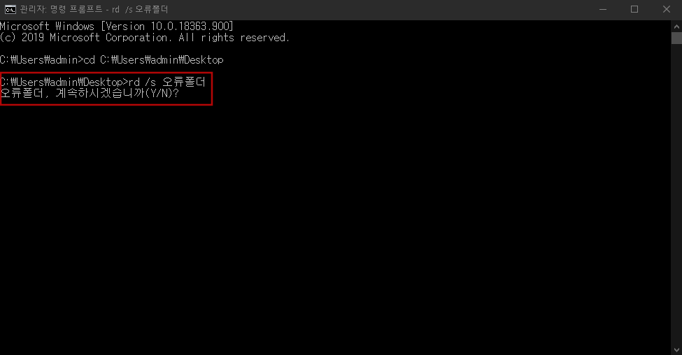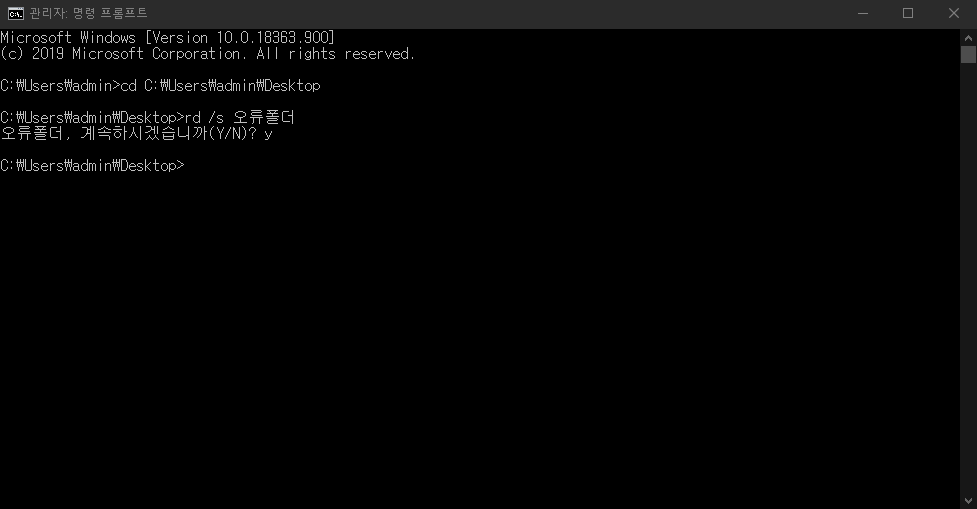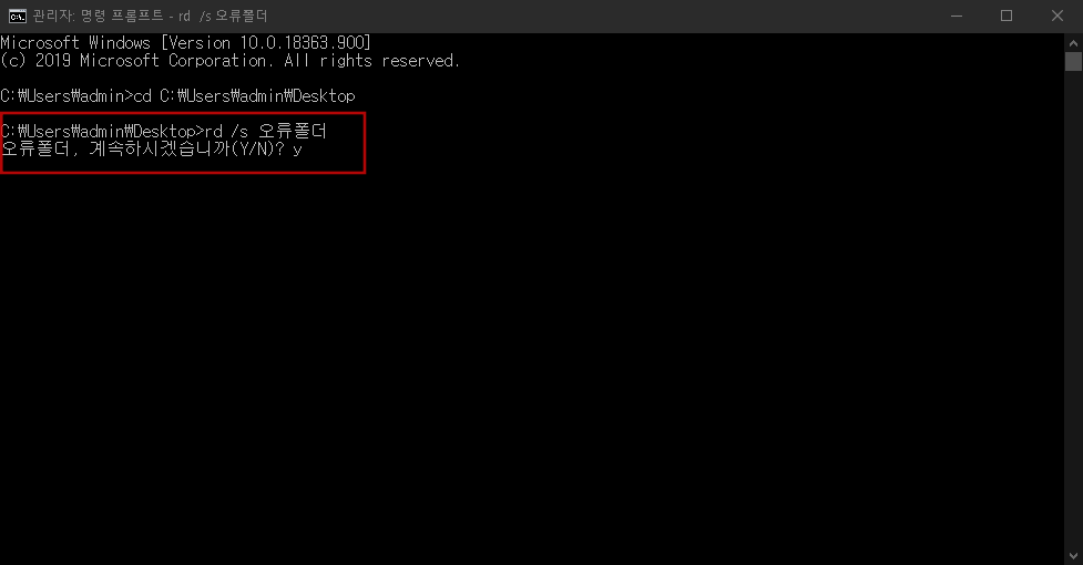 'rd /s 오류 폴더'라고 적습니다. 'rd' 한 칸 띄고 '/s' 한 칸 띄고 '폴더 이름'입니다.