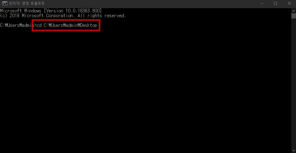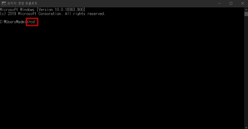 위와 같은 창이 뜨면 cd라고 적고 한 칸 띄고 좀 전에 복사해 놓았던 위치(경로)를 붙여 넣기 합니다. 윈도우10 기준 그냥 오른쪽 마우스를 클릭하면 자동으로 붙여 넣기가 됩니다.