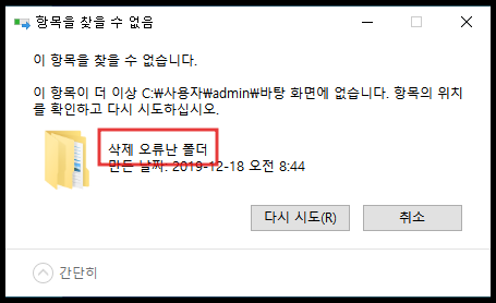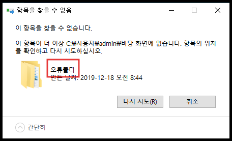 일단 이렇게 '이 항목을 찾을 수 없습니다' 또는 '지정된 파일을 찾을 수 없습니다'라고 오류난 폴더나 파일일의 이름을 변경해주어야 합니다.
