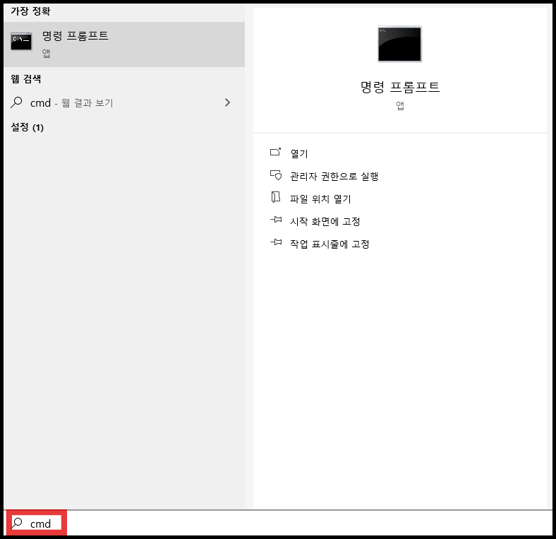 윈도 버튼이나 시작 버튼 또는 검색 버튼을 눌러 'cmd'라고 입력을 하고 '명령 프롬프트'가 나타나면 Enter를 누릅니다. 그러면 다음과 같은 도스 창이 뜰 것입니다.