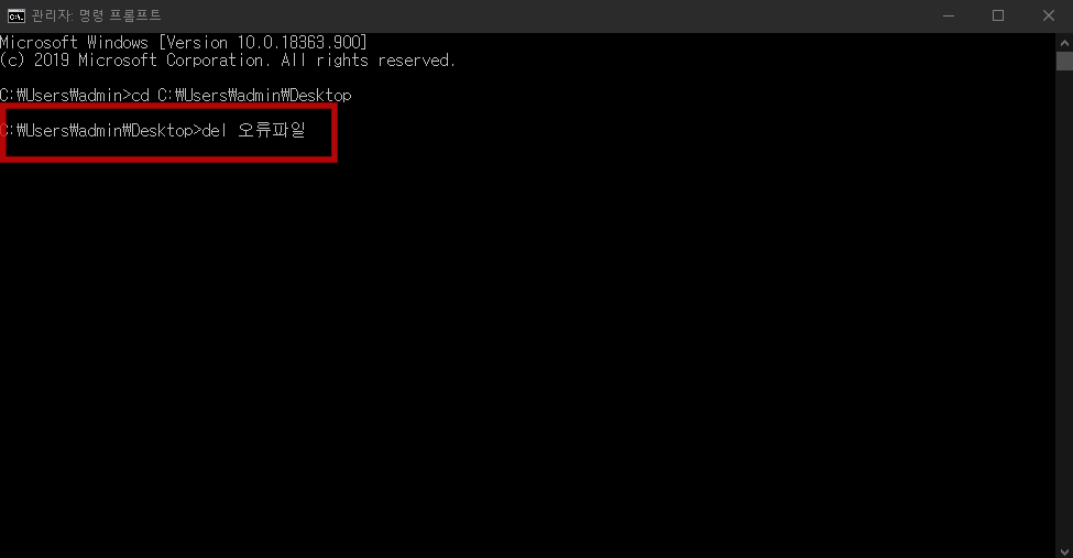 'del 오류 파일' 즉 'del'한 칸 띄고 '파일 이름'입니다.