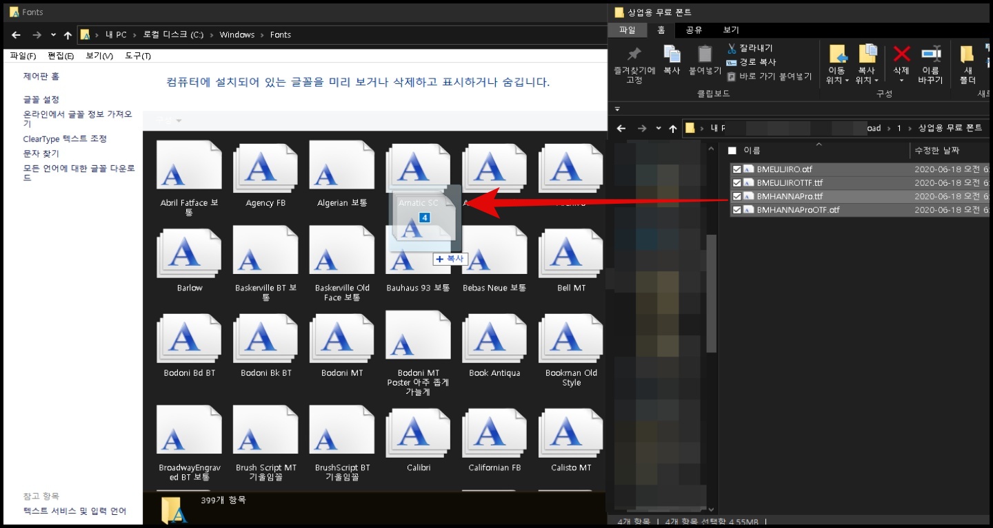 다운로드한 폰트 파일이 있는 폴더로 가서 모두 선택을 한 후 복사, 붙여 넣기 또는 드래그 & 드롭합니다.