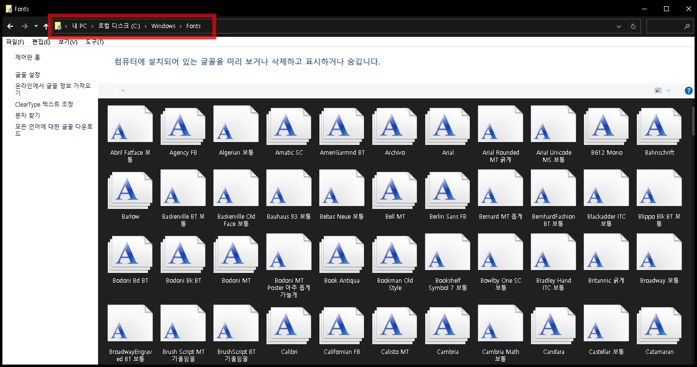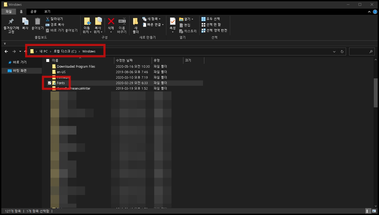 C:\Windows\Fonts 폴더로 이동합니다. 폰트 폴더를 더블클릭해 폴더를 열어 줍니다.