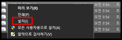 드래그 또는 모두 선택한 후 오늘 쪽 마우스 클릭 메뉴에서 설치를 클릭하면 한 번에 설치가 됩니다. 세 번째 방법이 가장 편리합니다. 다만 꼭 설치하겠다고 마음먹은 폰트만 선택해서 설치하시기 바랍니다. 한 번에 하다가 원하지 않는 폰트까지 설치하는 경우가 발생하게 됩니다.