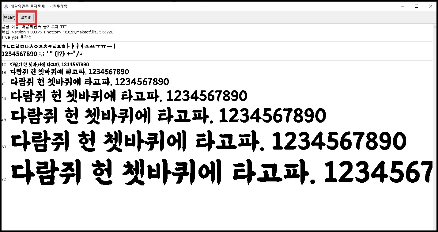 개별적으로 받은 폰트를 더블 클릭합니다. 그러면 다음과 같은 화면이 뜰 것입니다.