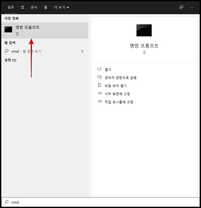 시작 검색에서 CMD라고 입력하고 명령 프롬프트 앱을 더블 클릭합니다. 또는 키보드에서 왼쪽 Alt 키 옆에 있는 윈도+R을 누르고 명령어 창에 CMD라고 입력한 후 확인을 누릅니다.