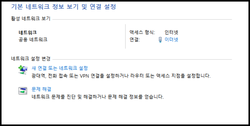 제어판-네트워크 및 인터넷 옵션을 클릭하면 이더넷의 상태를 볼 수 있을 것입니다. 식별되지 않은 네트워라고 뜨면 가장 먼저 문제 해결을 클릭해 어떤 문제가 있는지 진단을 해봅니다.
