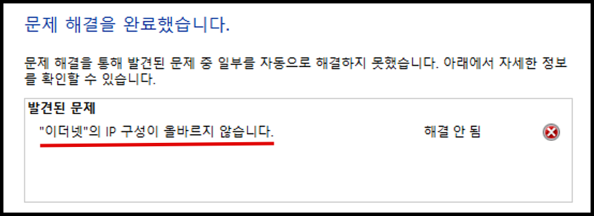 진단 결과 '이더넷의 IP구성이 올바르지 않습니다.'라고 뜬 경우