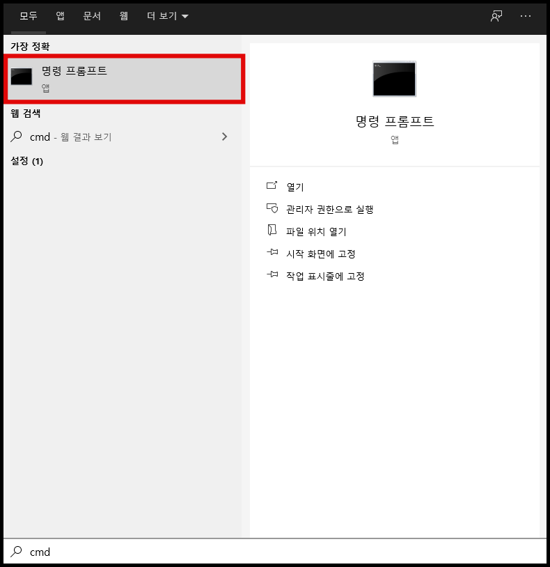 윈도우 시작 검색에 cmd라고 검색을 합니다.
