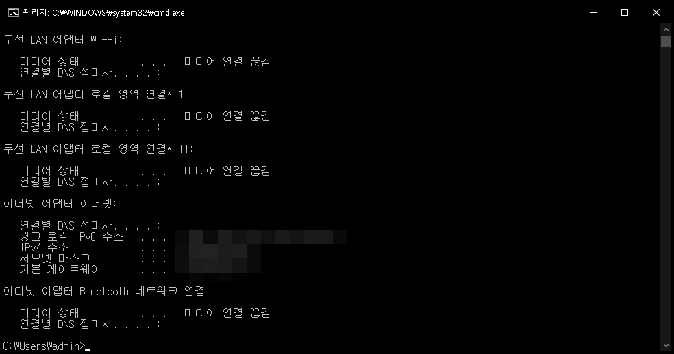 IP 구성과 이더넷 어댑터, 터널 어댑터의 상태 등이 나올 것입니다.