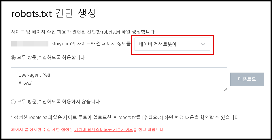 '네이버 검색로봇'이 라고 되어 있는 옵션을 '모든 검색로봇이' 옵션으로 변경해 준후 생성된 robots.txt 파일을 다운로드합니다.