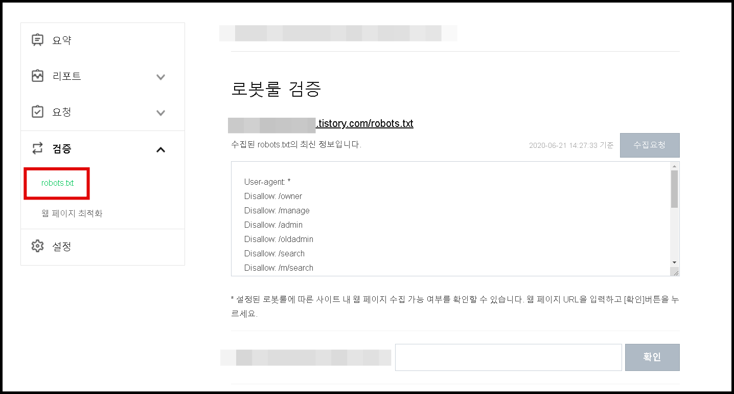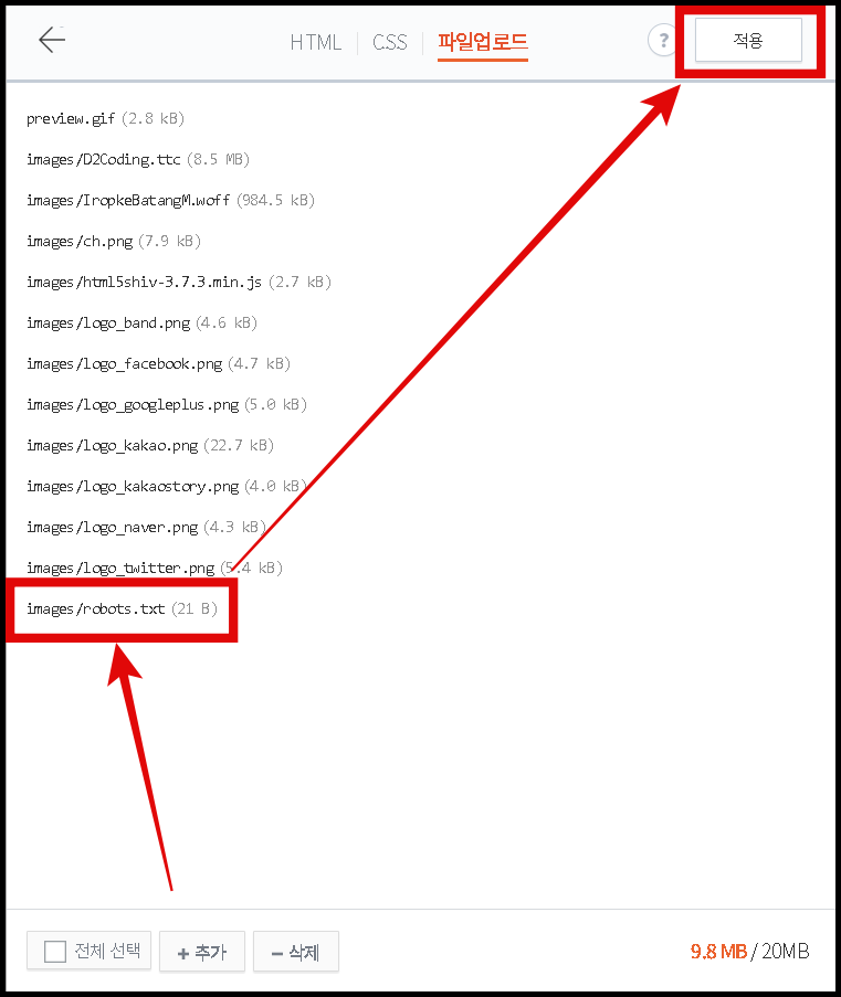 추가를 눌러 조금 전에 네이버 웹마스터 도구를 이용해 생성한 robots.txt을 추가해줍니다.