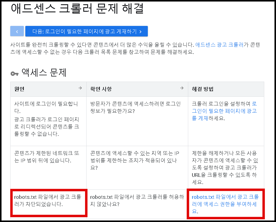 문제 해결을 위한 방법을 제시하고 있지만 구글에서 제시한 문제 해결 방법은 사이트를 따로 운영하는 사람에게 해당되는 이야기이다. 티스토리 블로거는 사이트에 대한 접근권한이 없기 때문에 이런 해결 방법은 티스토리 블로거에게는 도움이 되지 못합니다. 티스토리 블로거는 티스토리 시스템 관리자가 아니기 때문에 robots.txt 파일에서 광고 크럴러에 액세스 권한을 부여할 수 없습니다.