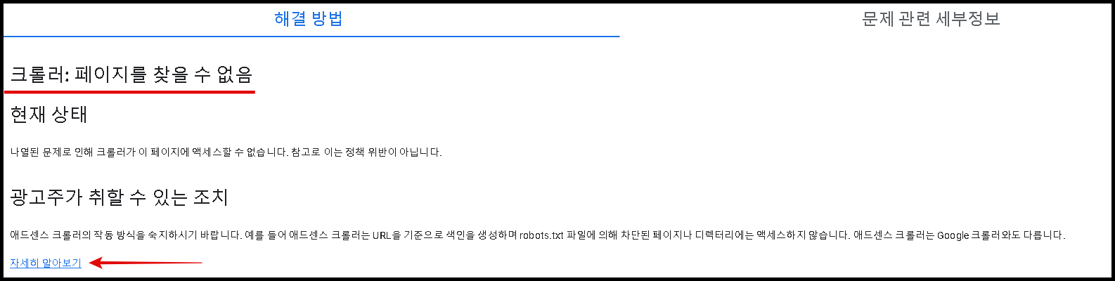 문제 해결을 위한 방법을 제시하고 있지만 구글에서 제시한 문제 해결 방법은 사이트를 따로 운영하는 사람에게 해당되는 이야기이다. 티스토리 블로거는 사이트에 대한 접근권한이 없기 때문에 이런 해결 방법은 티스토리 블로거에게는 도움이 되지 못합니다. 티스토리 블로거는 티스토리 시스템 관리자가 아니기 때문에 robots.txt 파일에서 광고 크럴러에 액세스 권한을 부여할 수 없습니다.