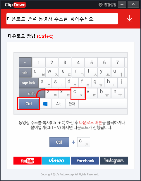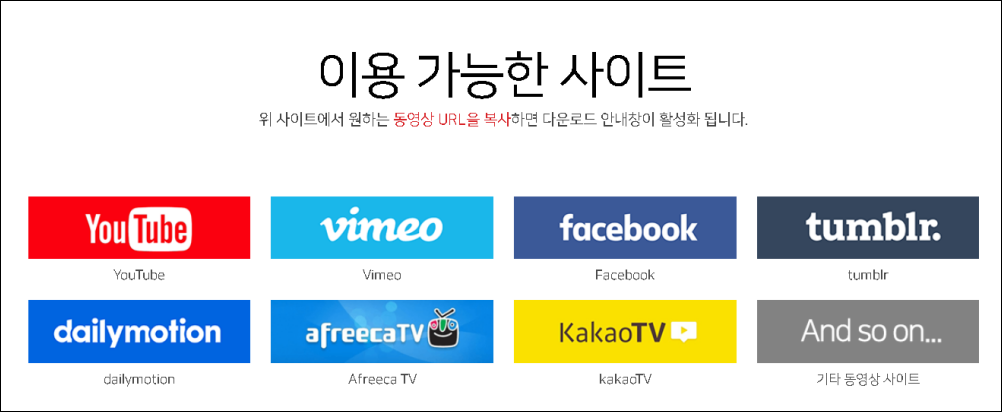 또한 유튜브 동영상뿐만 아니라 vimeo, facebook, tumblr. dailymotion, afreecaTV, KaKaoTV 등 다양한 사이트의 동영상을 고화질로 다운로드할 수 있습니다. 인스타그램(instagram)에서도 동영상을 다운로드할 수 있습니다.