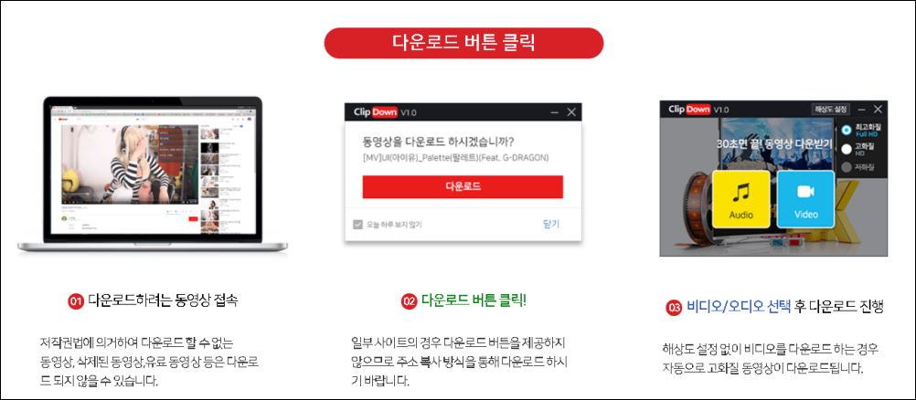 유튜브 클립다운의 다운로드 과정을 간단하게 정리하면 아래 사진과 같습니다.