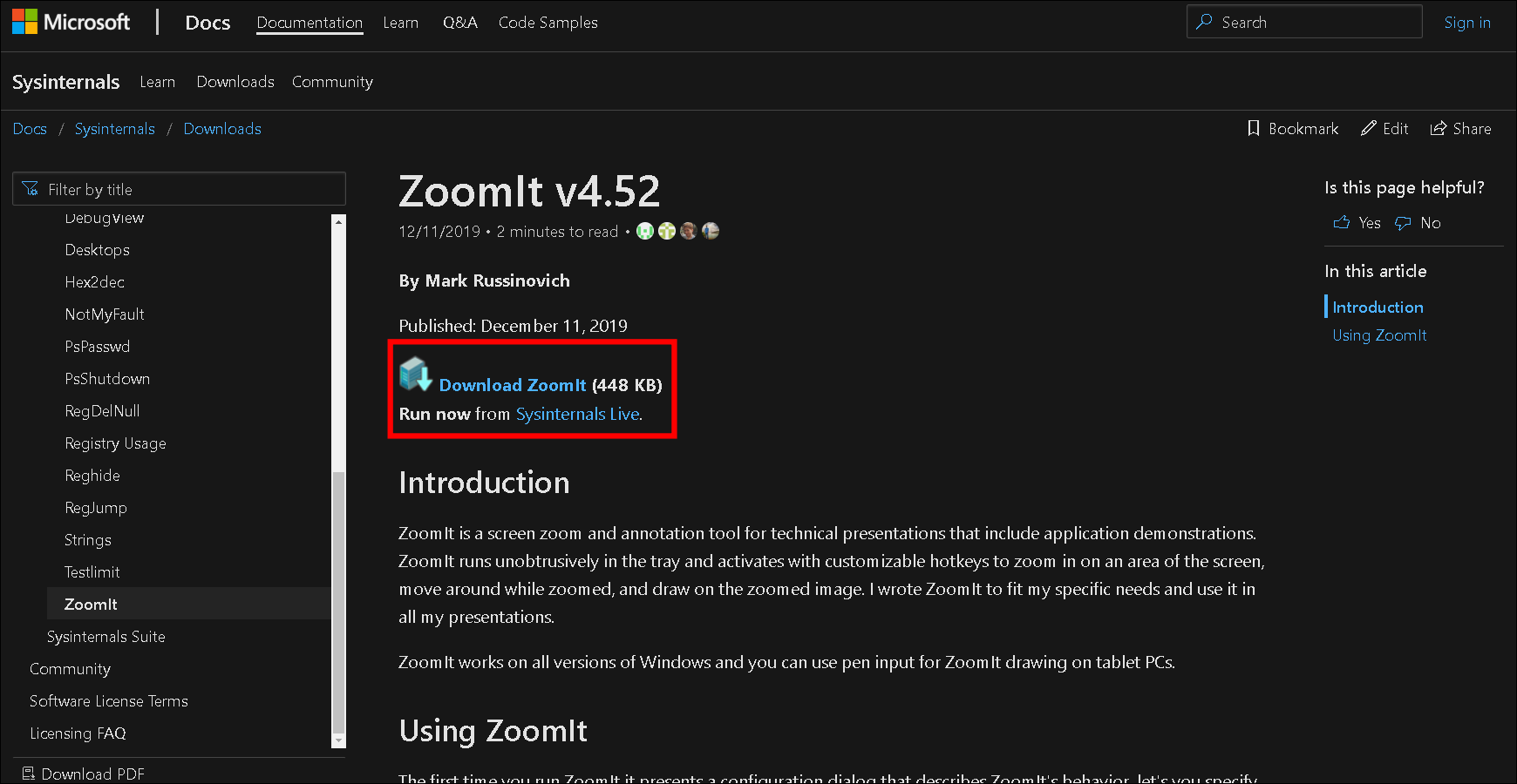 실제 유튜브 강의나 온라인 학원 강의에서도 많이 사용되고 있는 무료 프로그램입니다. 다운로드는 아래 Zoomit Download 클릭 또는 홈페이지에 가서 다운로드하시면 됩니다.