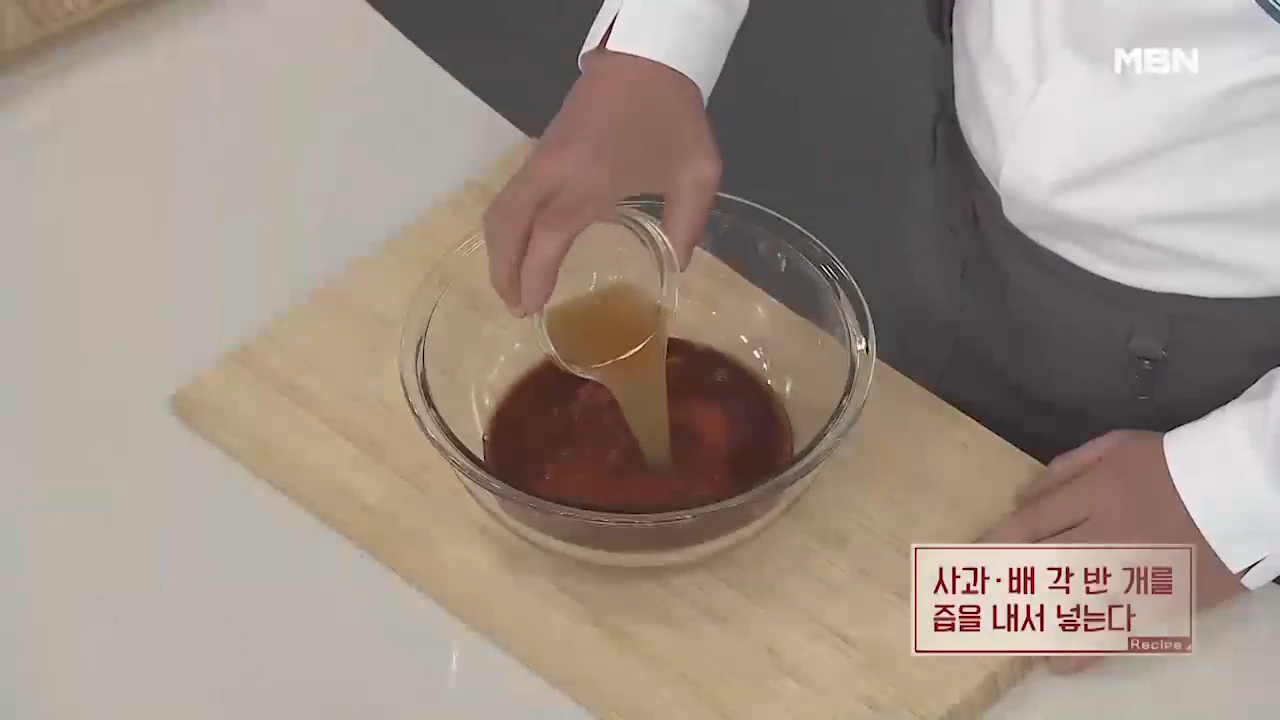 ▶사과 반 개를 즙을 내서 넣어 줍니다.