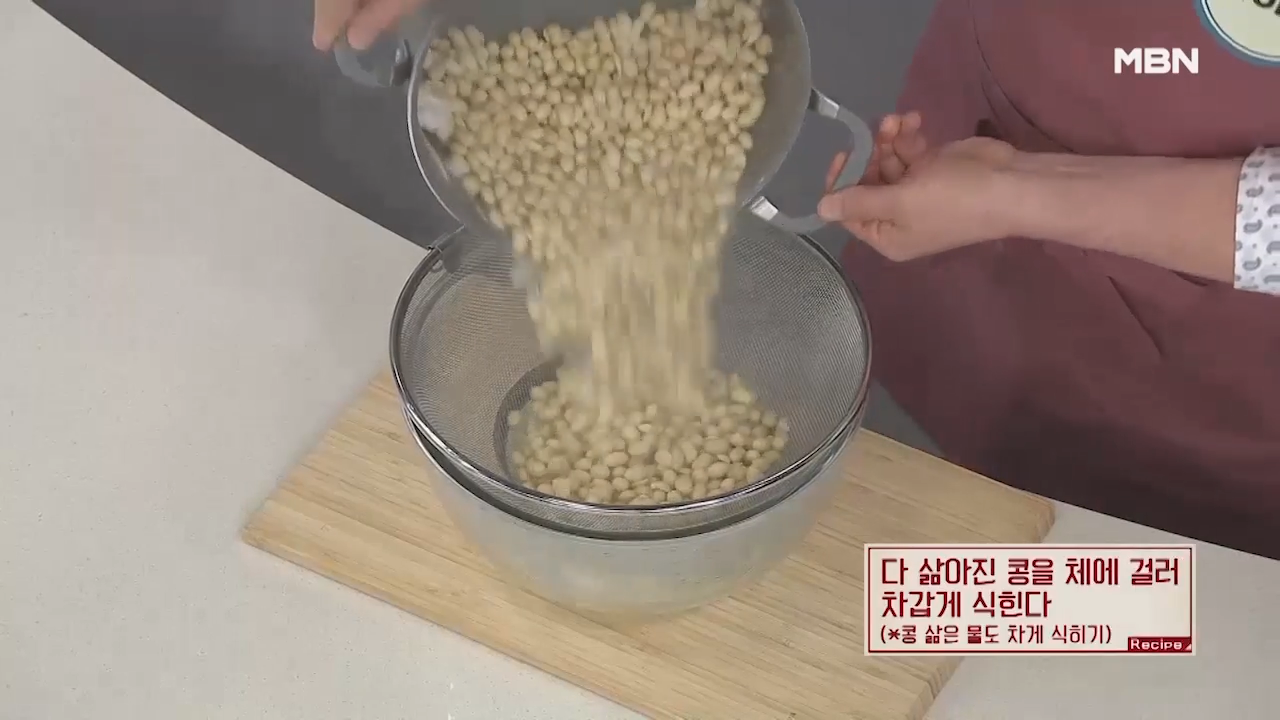 4. 다 삶아진 콩을 체에 걸러 차갑게 식혀 줍니다.