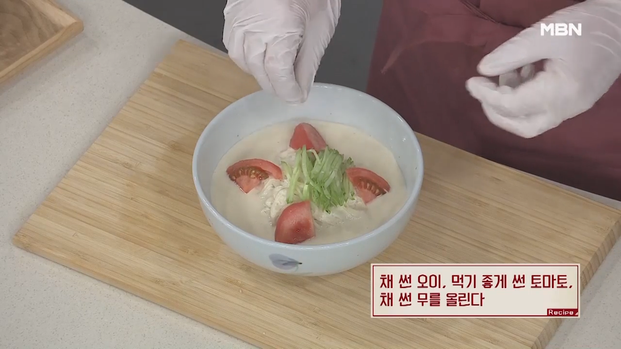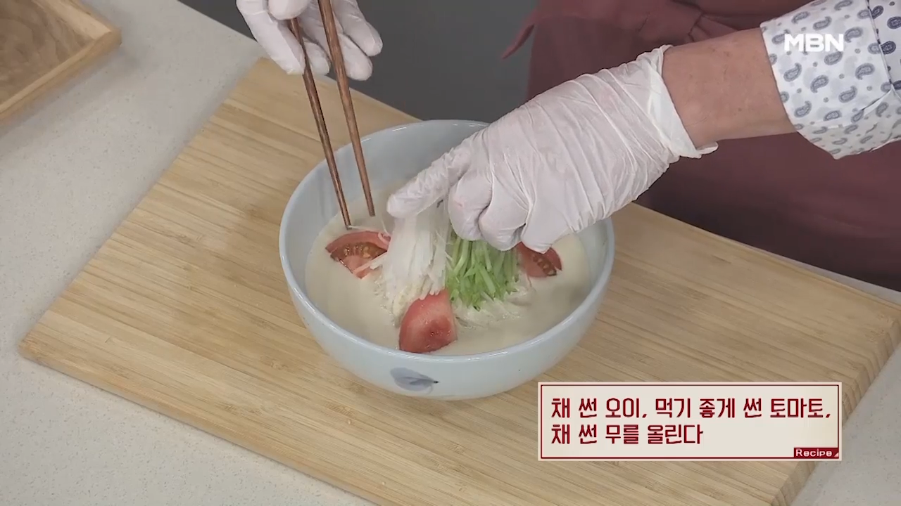 채 썬 오이, 썬 토마토, 채 썬 무, 고명