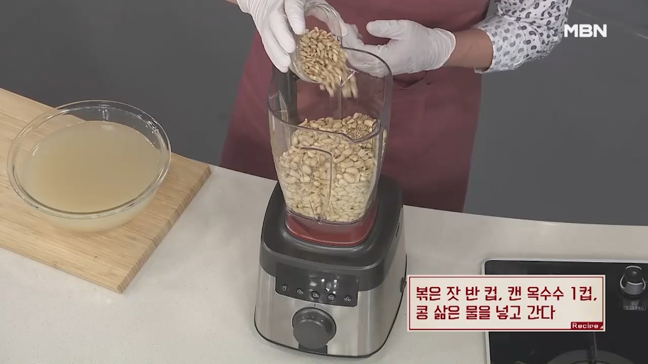 6. 볶은 잣 반 컵, 캔 옥수수 1컵, 콩 삶은 물을 넣고 갈아줍니다.