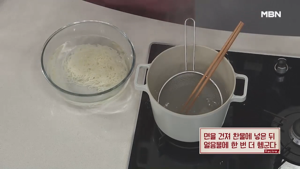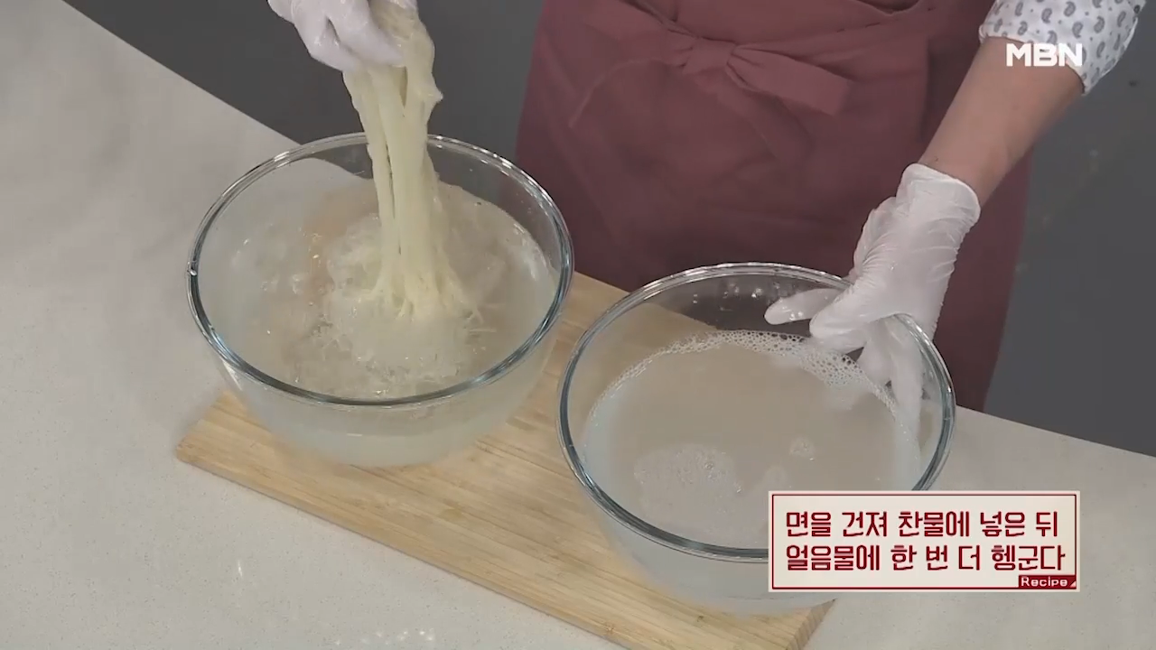 10. 면을 건져 찬물에 넣은 뒤 얼음물에 한 번 더 헹궈줍니다.