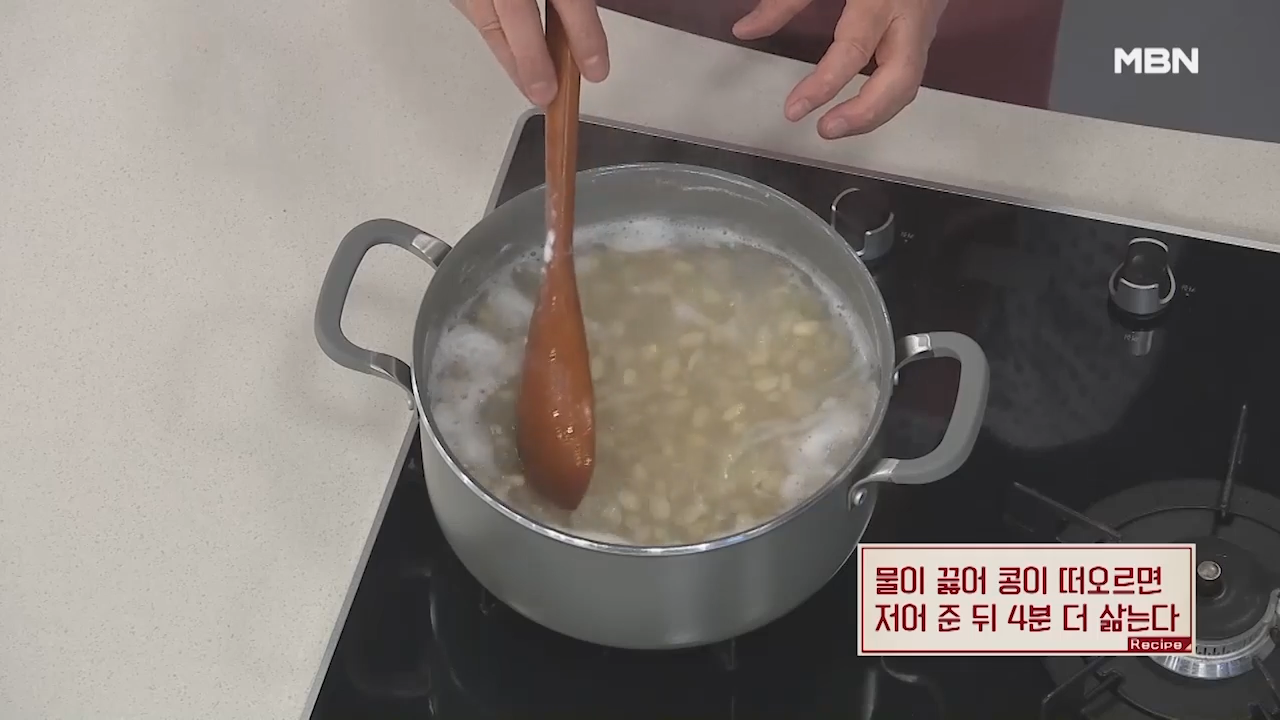 3. 물이 끓어 콩이 떠오르면 저어 준 뒤 4분 더 삶아줍니다.