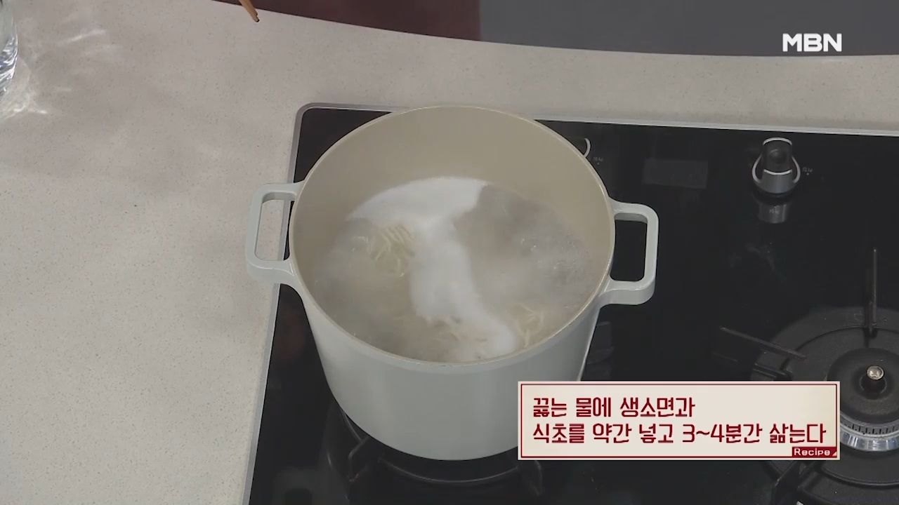 9. 끓는 물에 생소면과 식초를 약간 넣고 3~4분간 삶아 줍니다.