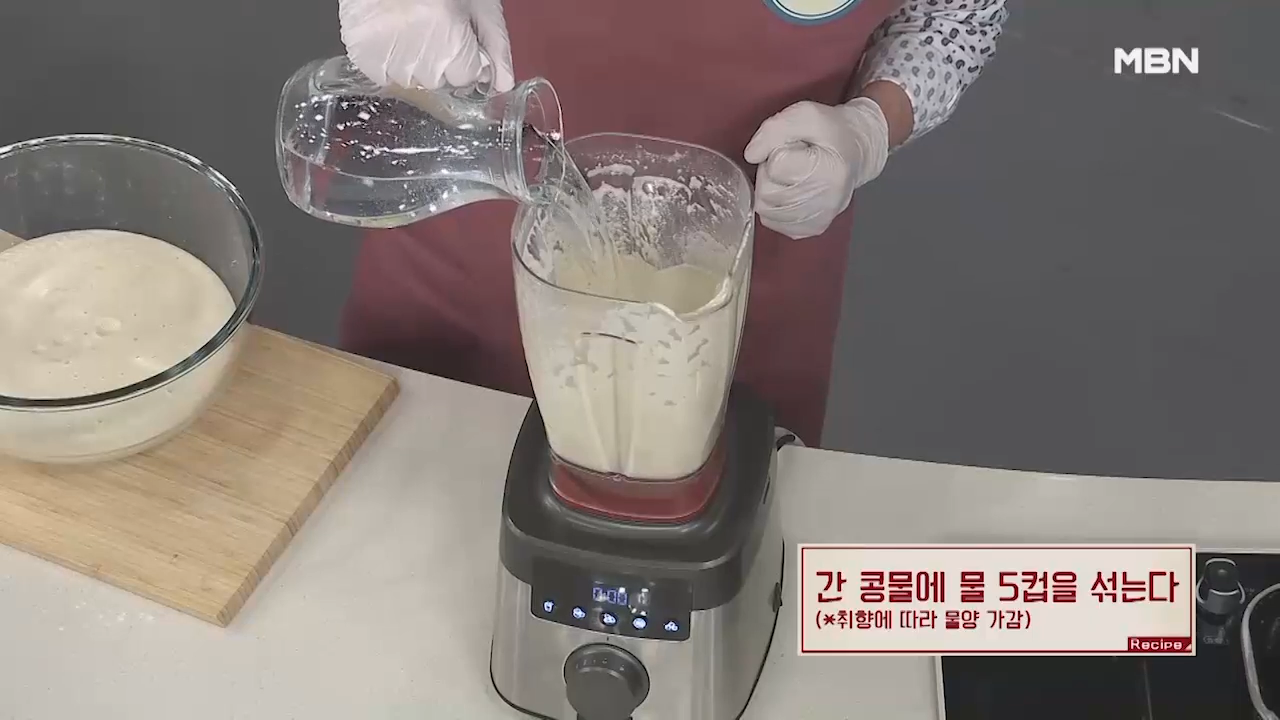 취향에 따라 물의 양을 가감하며 콩물의 농도를 조절합니다.