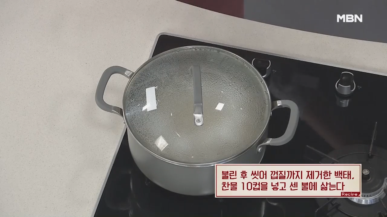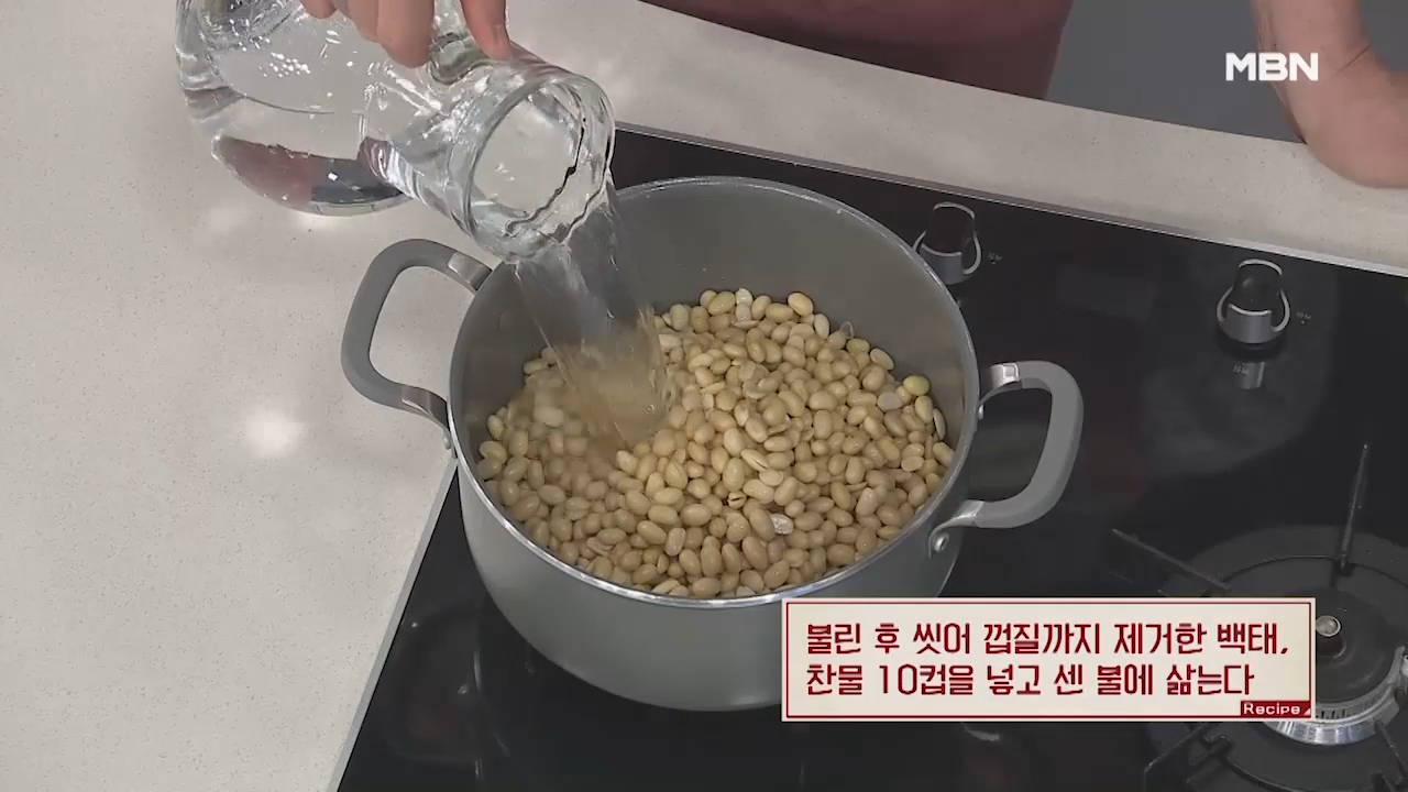 2. 불린 후 씻어 껍질까지 제거한 백태에 찬물 10컵을 넣고 센 불에 삶아줍니다.