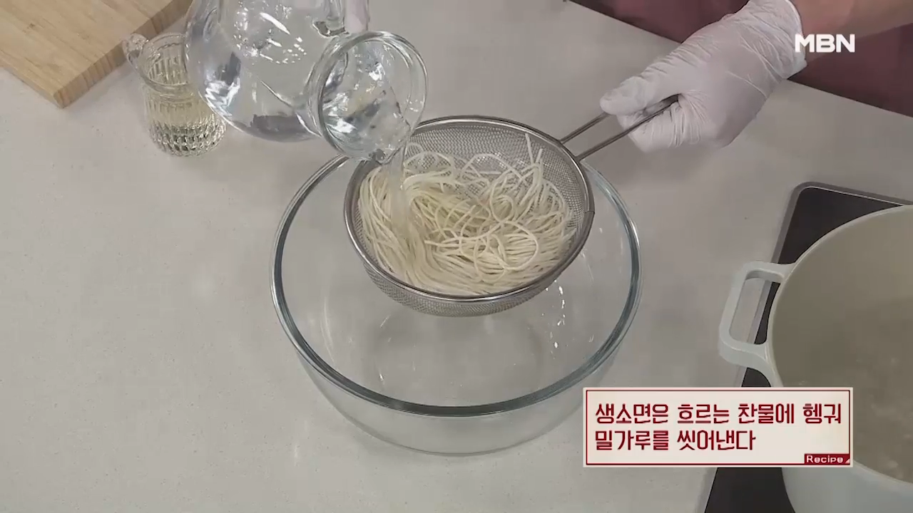 8. 생소면은 흐르는 찬물에 헹궈 밀 가루를 씻어냅니다.