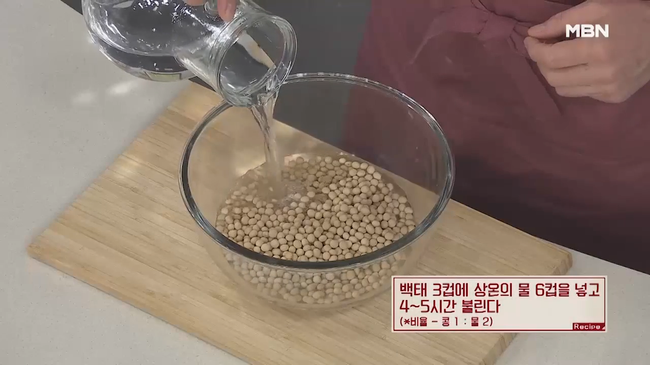 이때 콩과 물의 비율은 콩 1 물 2입니다. 오래 불려야 잘 익고 잘 삶아집니다.