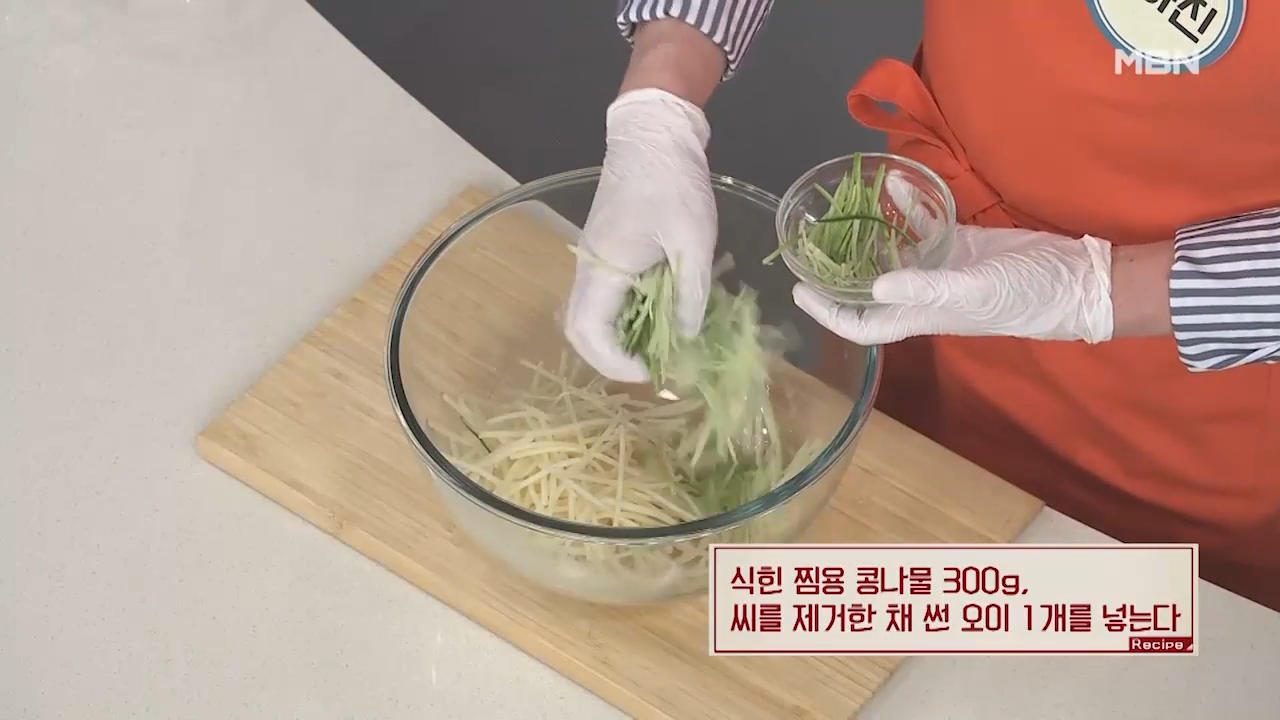 식힌 찜용 콩나물 300g, 씨를 제거한 채 썬 오이 1개를 넣어 줍니다.