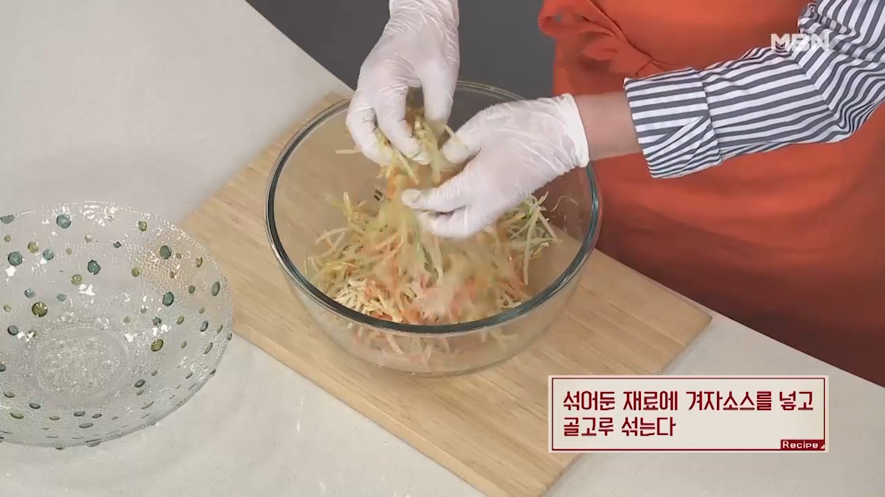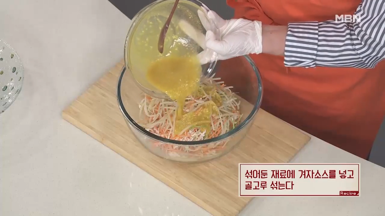 오이, 당근, 맛살과 섞어둔 콩나물 재료에 겨자소스를 넣고 골고루 버무려 줍니다.